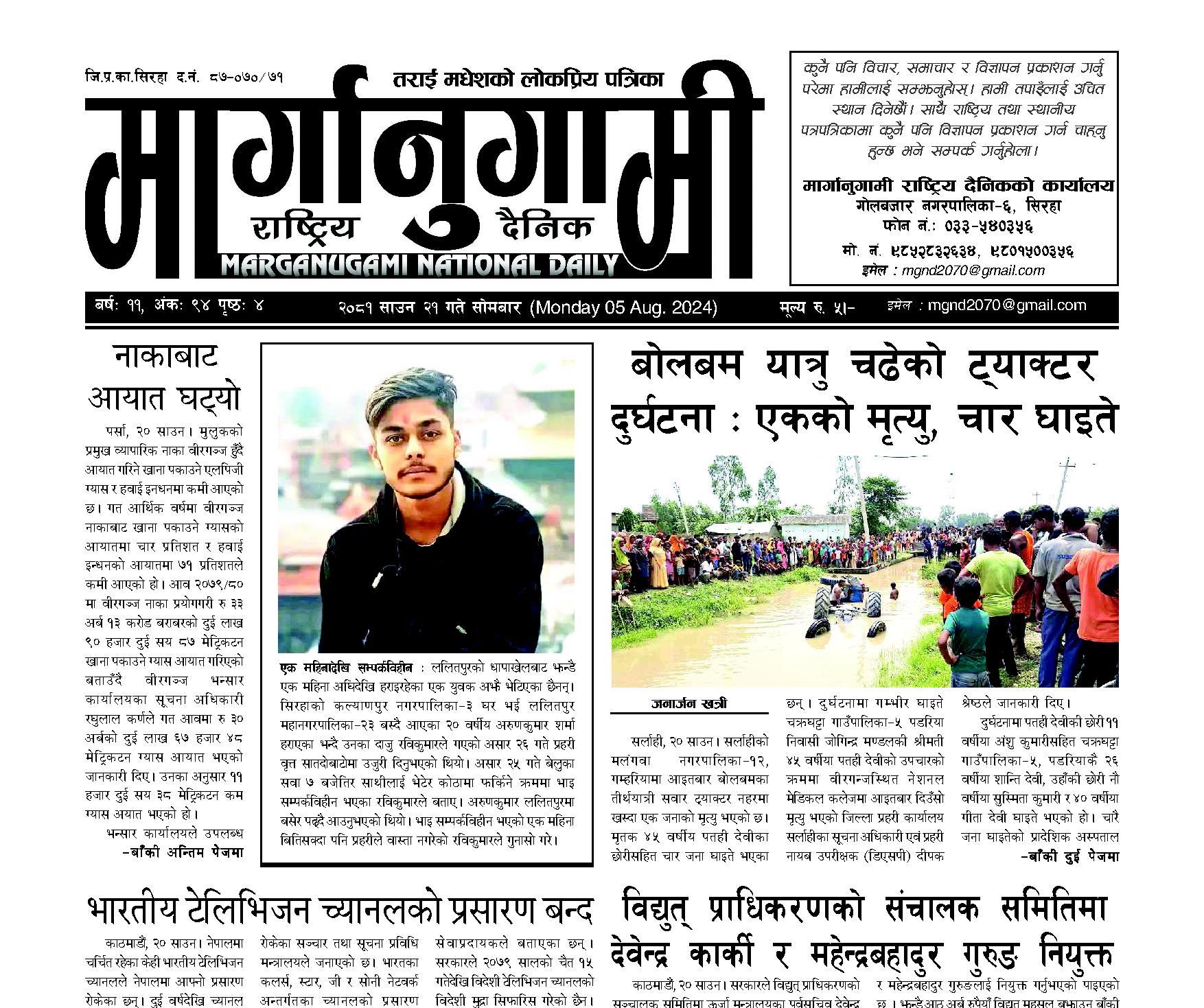 २०८१ साउन २१ गते सोमबार (Monday 05 Aug. 2024)